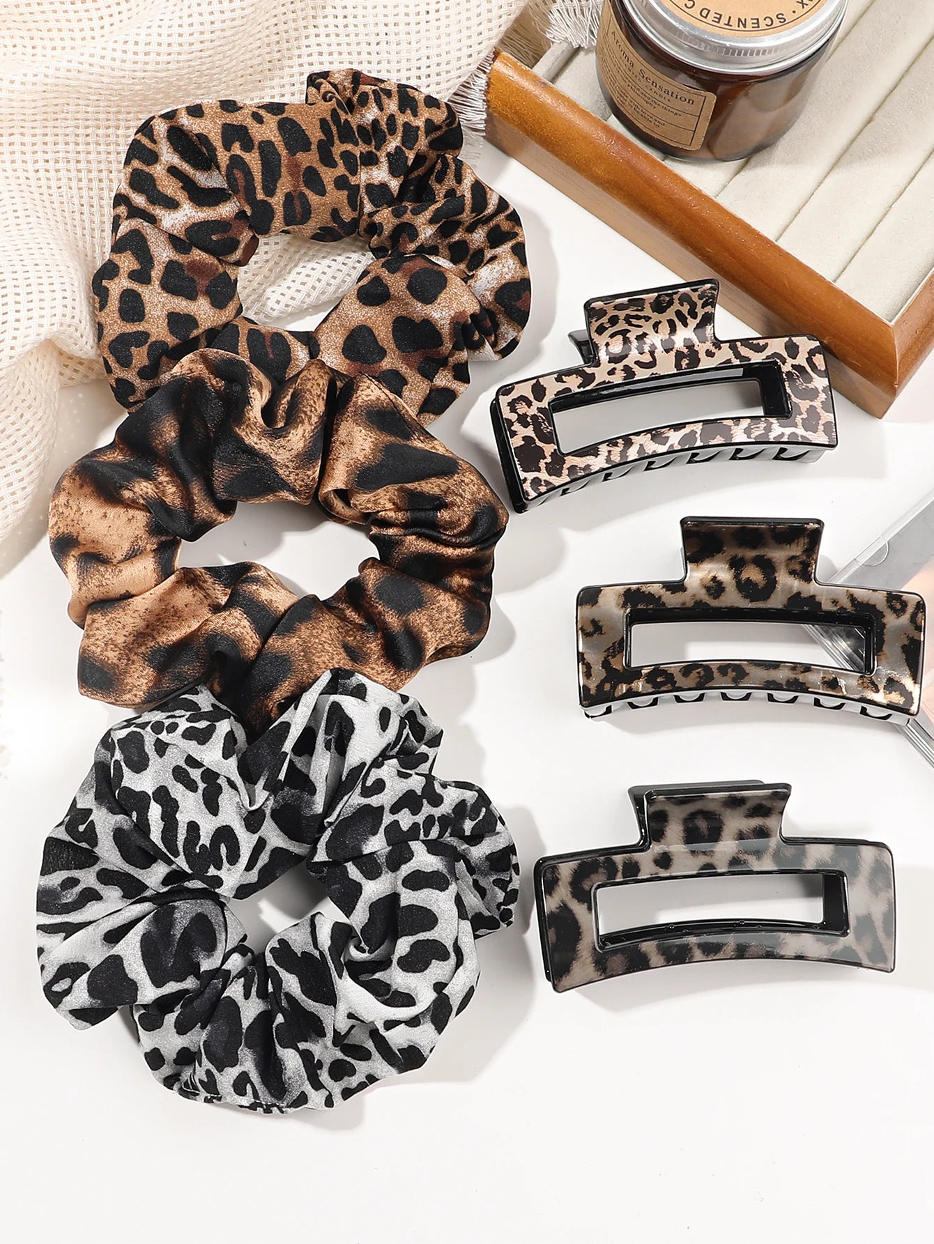 L'élégance au quotidien pour vos cheveux. Ce set de 6 accessoires cheveux léopard comprend 3 pinces clips et 3 chouchous en soie pour créer des coiffures élégantes et variées avec facilité.