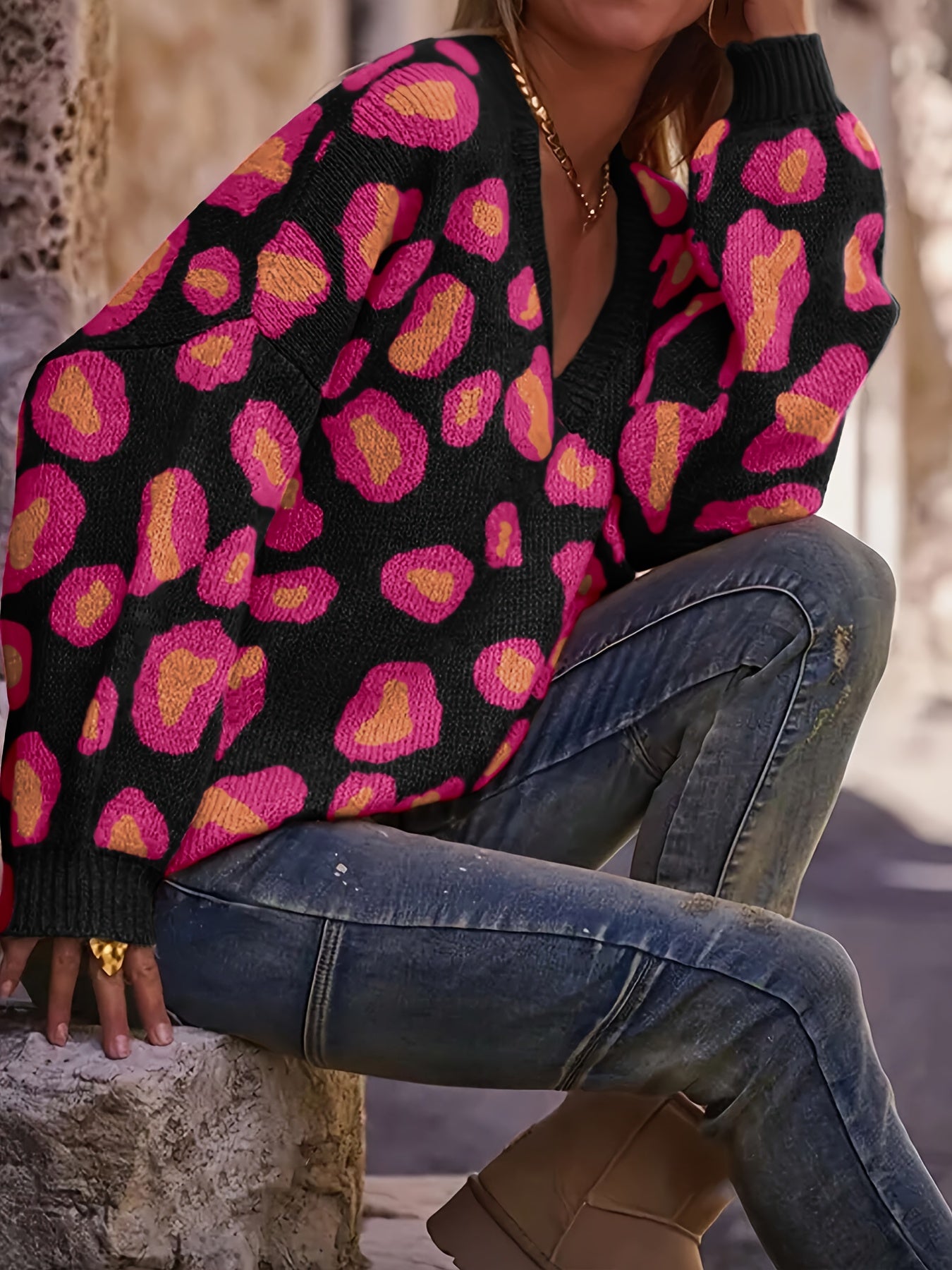 L'audace léopard en version aléatoire. Ce pull chic en polyester avec son imprimé léopard aléatoire noir et rose apporte une touche de caractère affirmé à votre garde-robe automne-hiver.