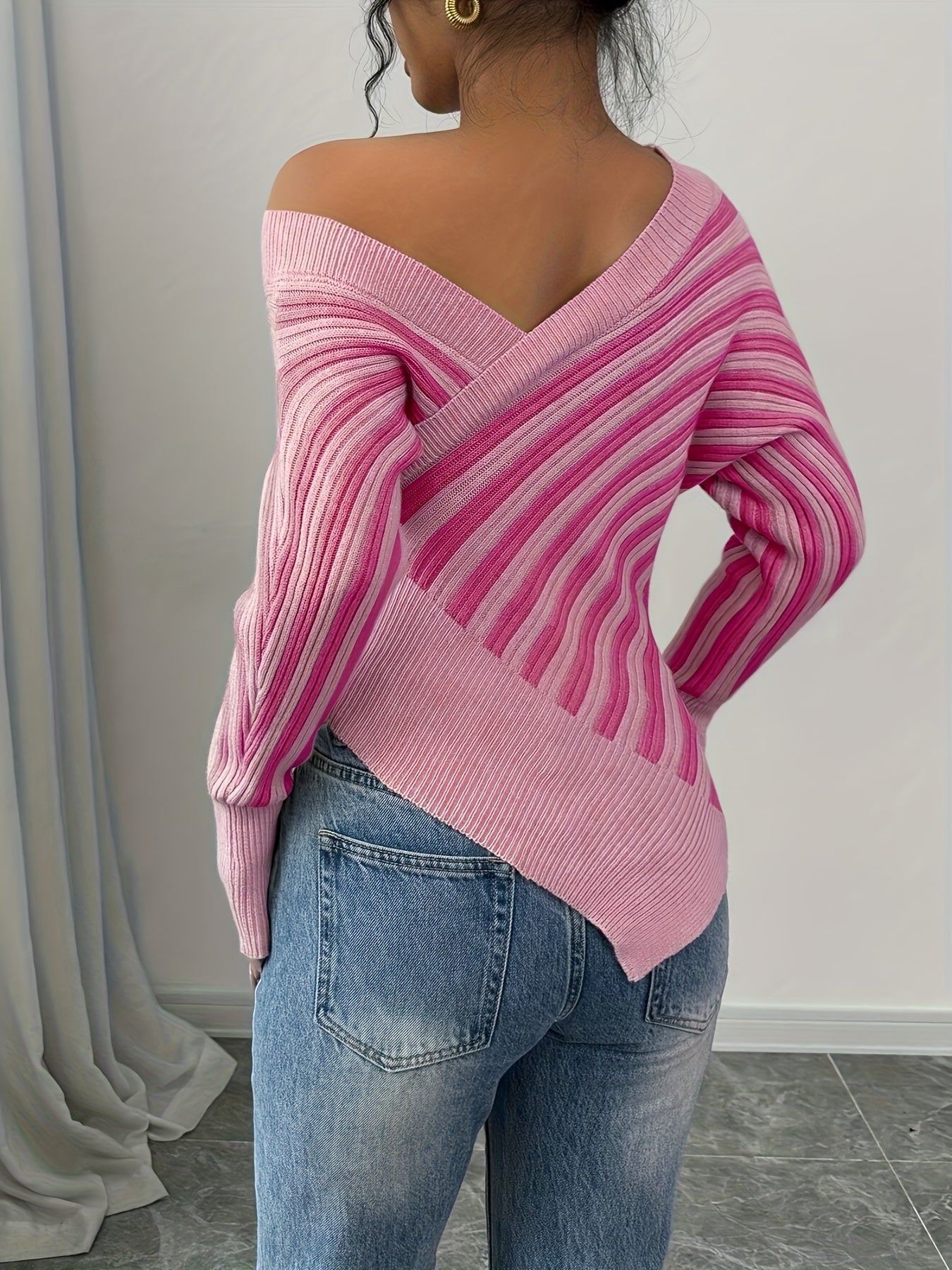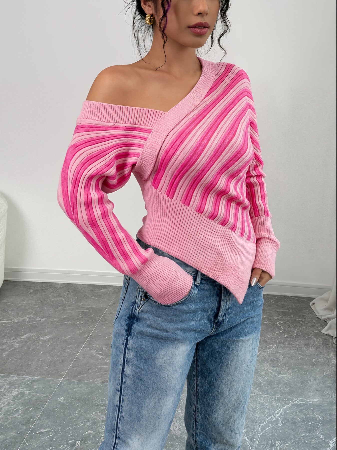✨ Points clés : Épaules dénudées • Rayures roses et blanches • Ourlet asymétrique • Texture côtelée • Extensible • Parfait automne/hiver