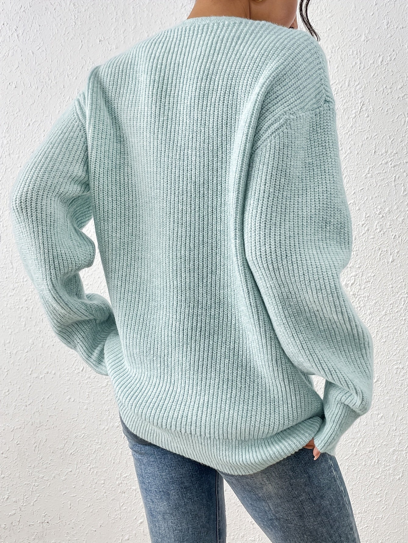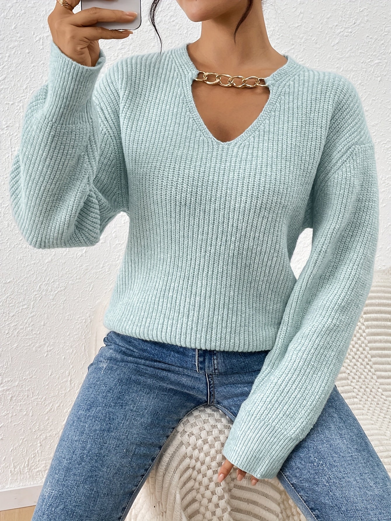 ✨ Points clés : Col en V élégant • Détail chaîne dorée • 100% Acrylique doux • Manches longues • Élasticité moyenne