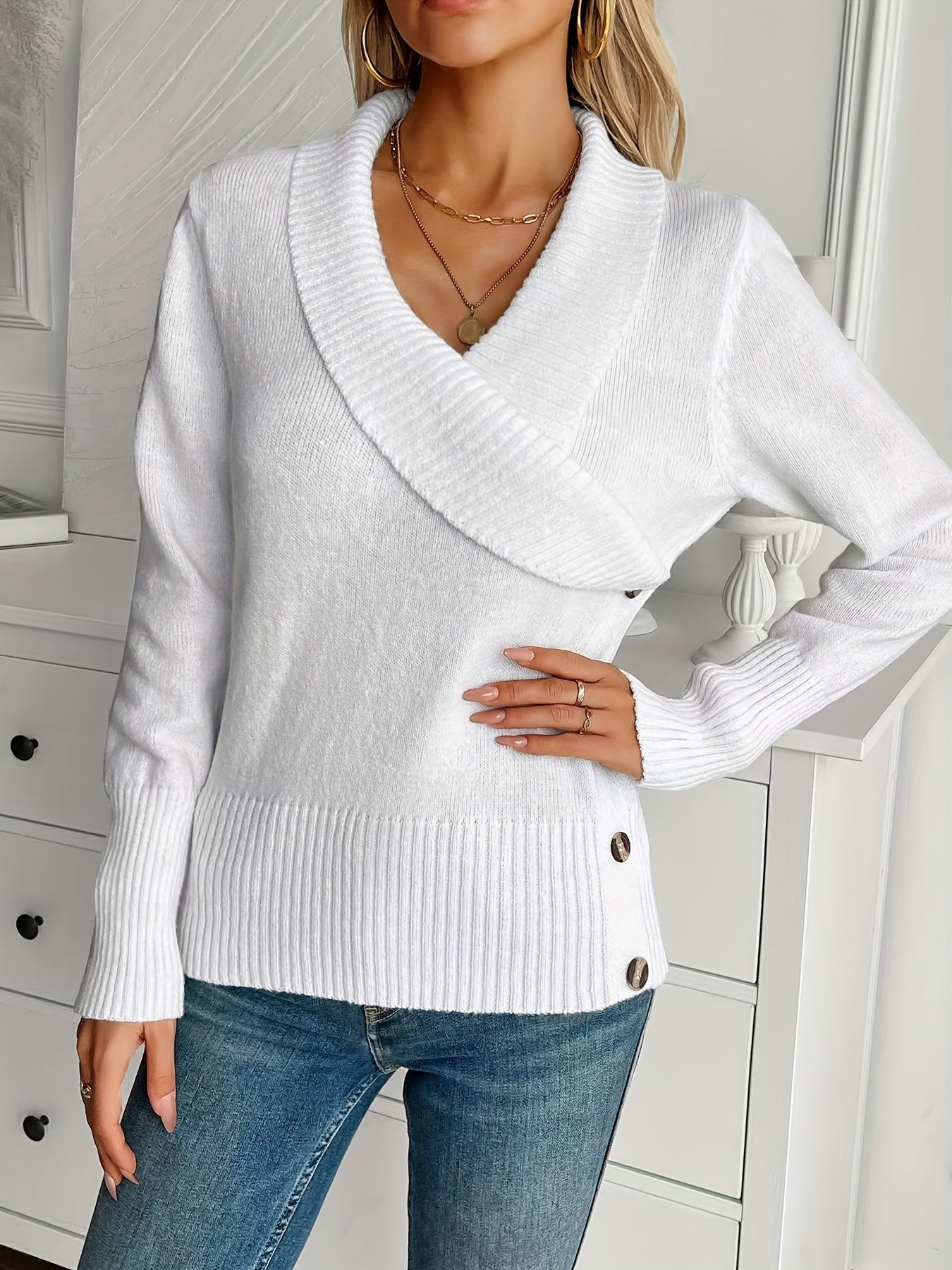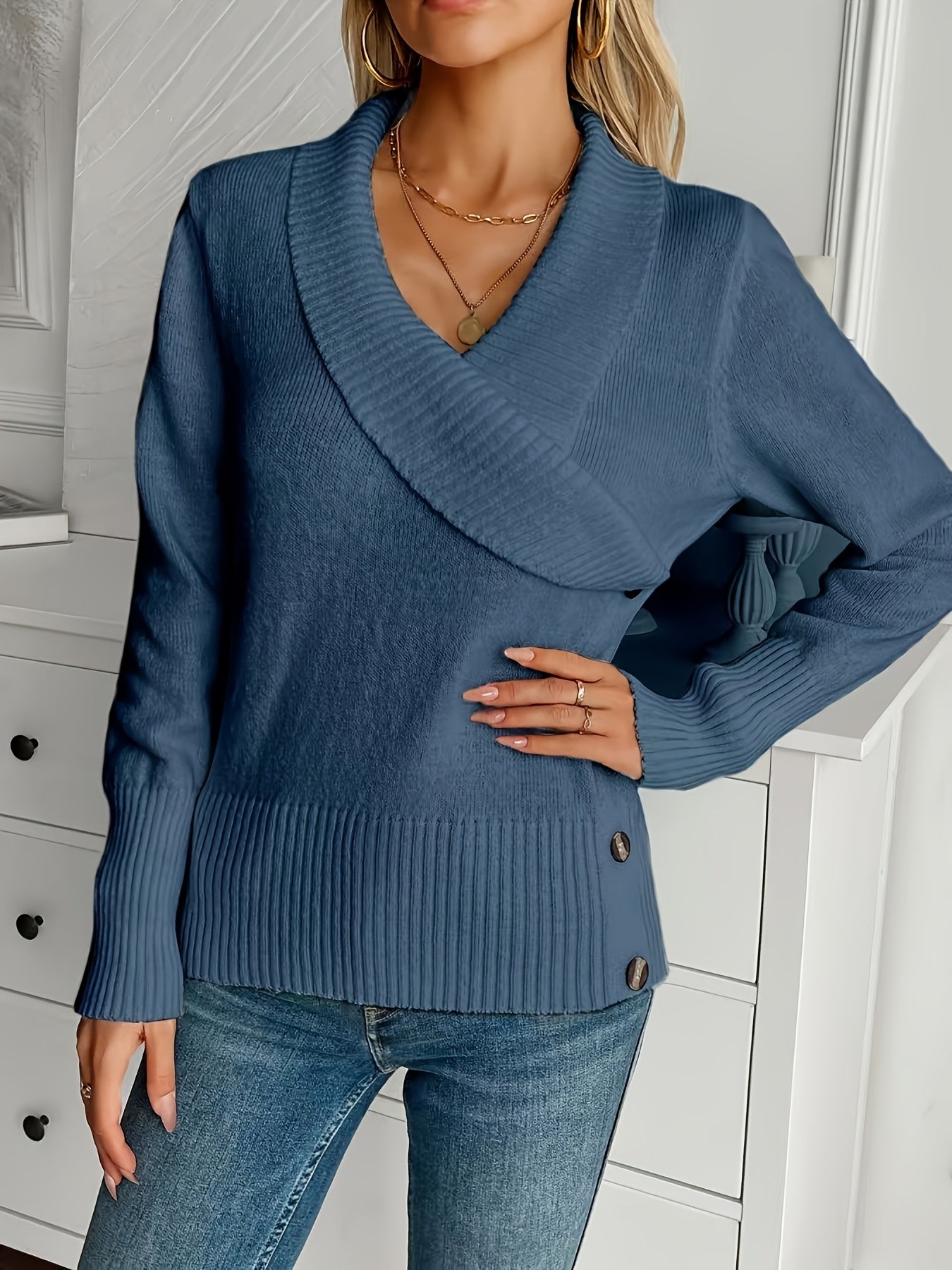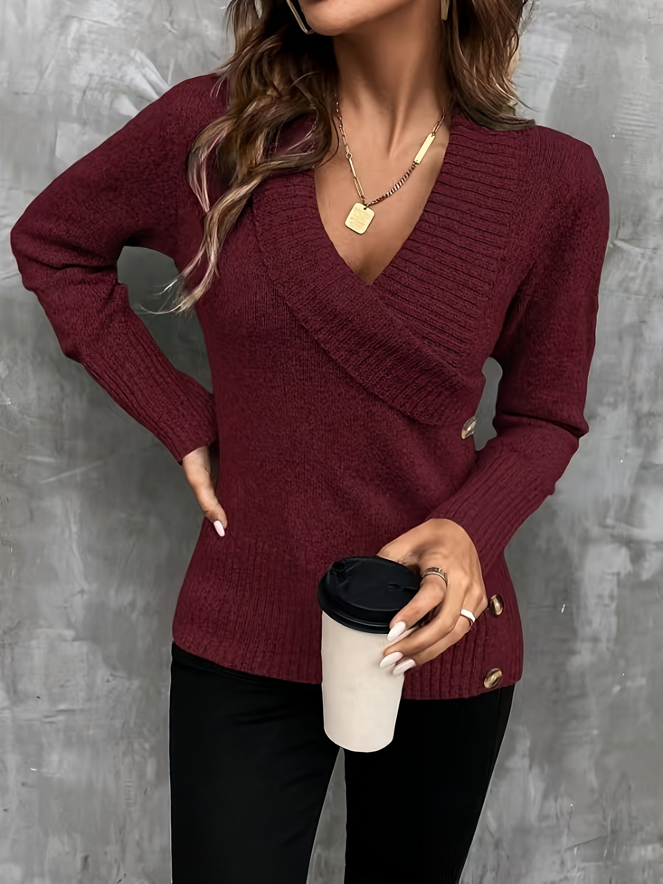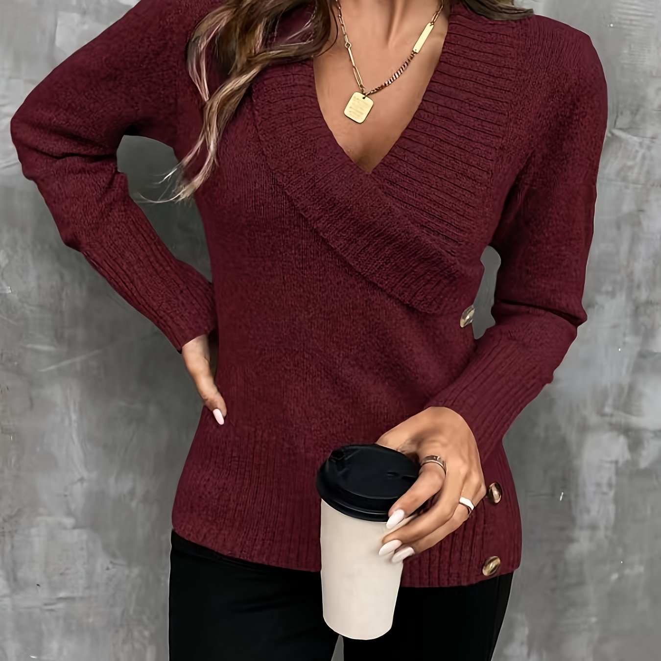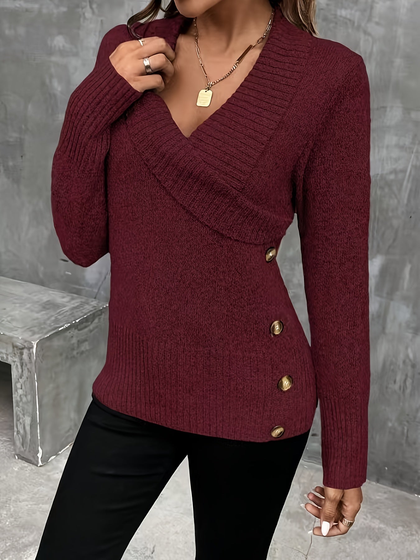 ✨ Points clés : Col V élégant • Détails faux boutons raffinés • 100% Polyester doux • Élasticité moyenne • Coupe régulière flatteuse
