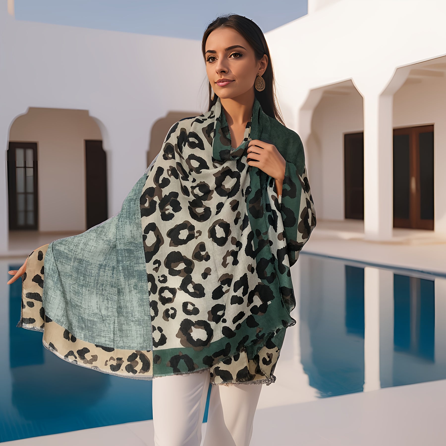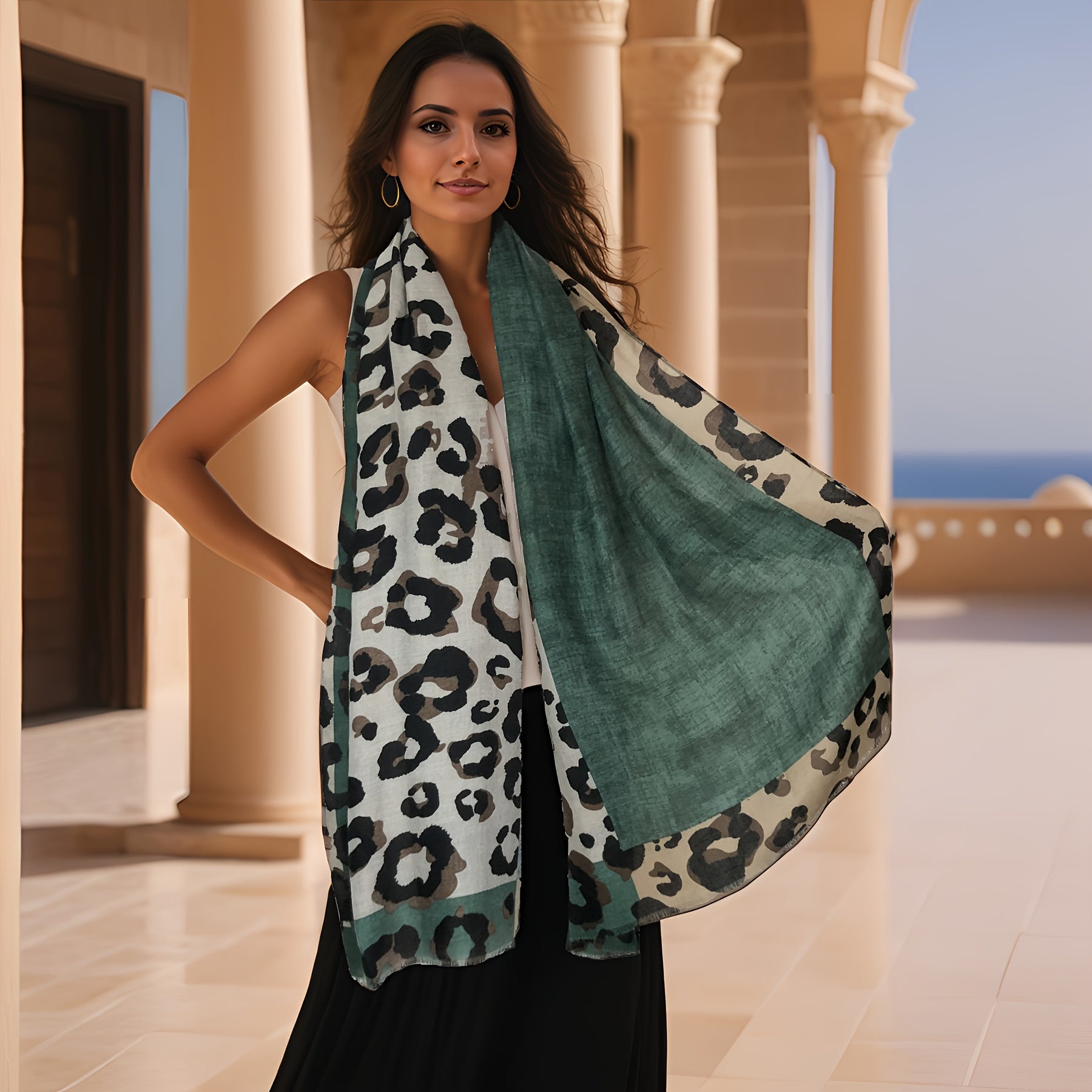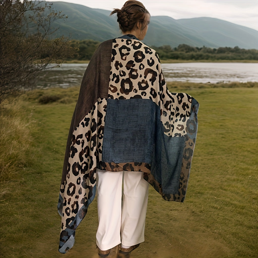 ✨ Points clés : Viscose douce et épaisse • Franges avec pompons • Motifs géométriques léopard • Style bohème • Polyvalent : écharpe, châle ou turban • Toutes saisons • 180×75 cm