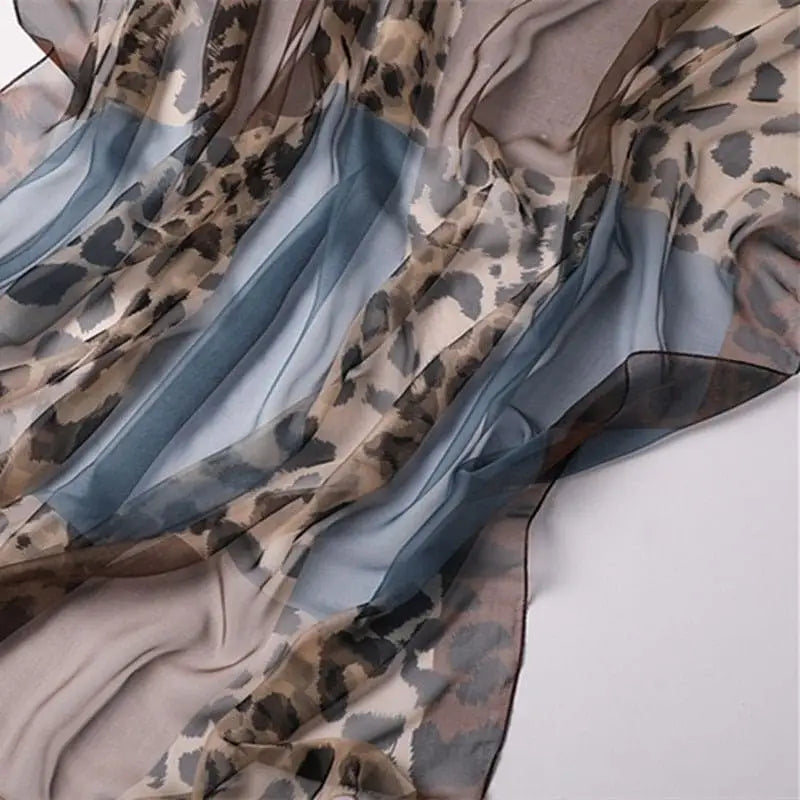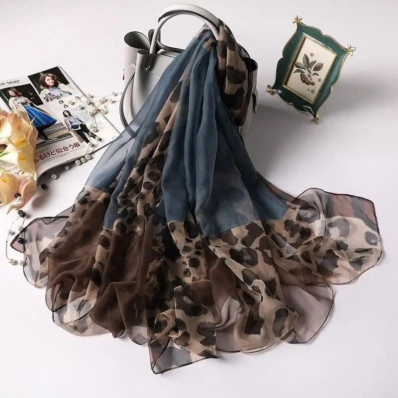 ✨ Points clés : Matière fine et fluide • Touches bleues élégantes • Imprimé léopard marron • Viscose douce • Parfaite printemps • 180 × 135 cm