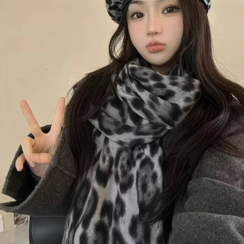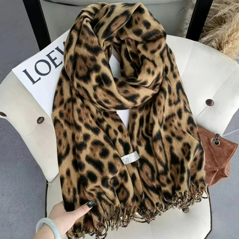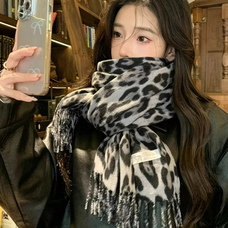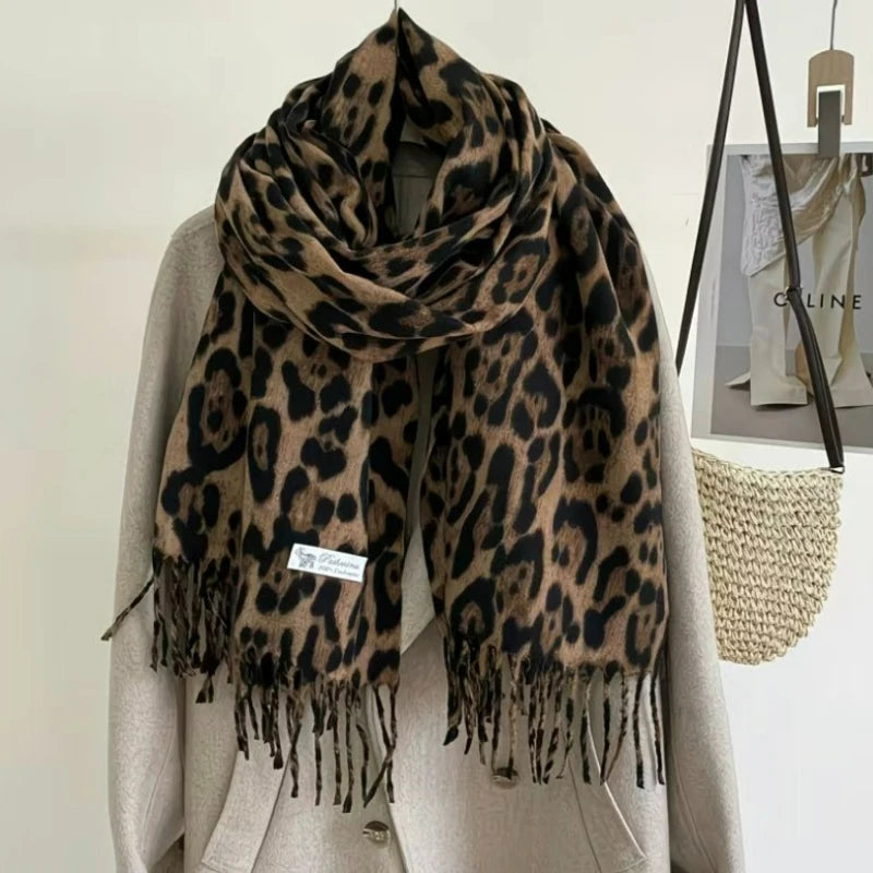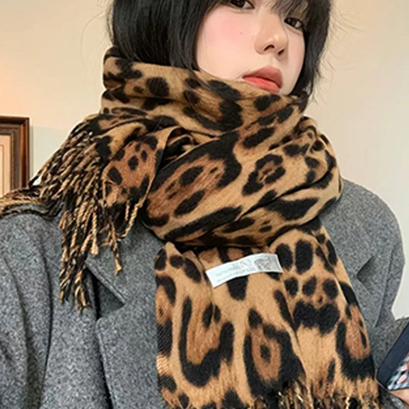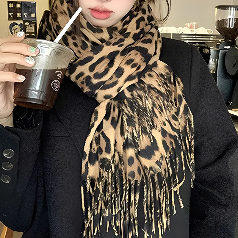 L'esprit rétro rencontre l'élégance léopard. Cette écharpe épaisse double-face à franges allie chaleur et style avec son imprimé léopard tendance, parfaite pour vos tenues automne-hiver.