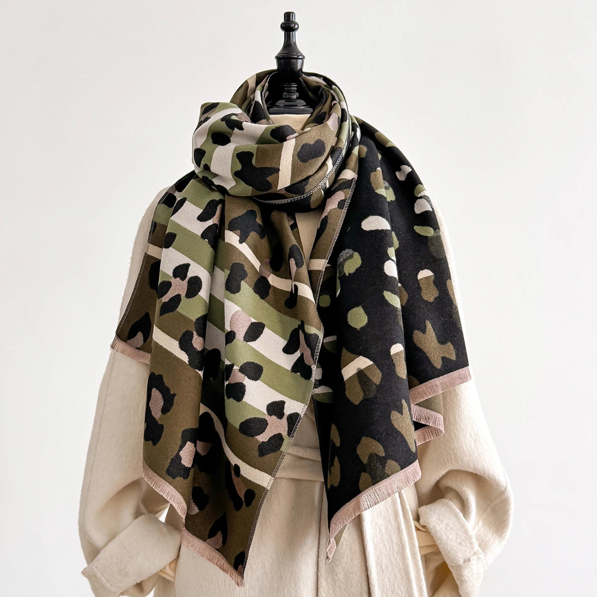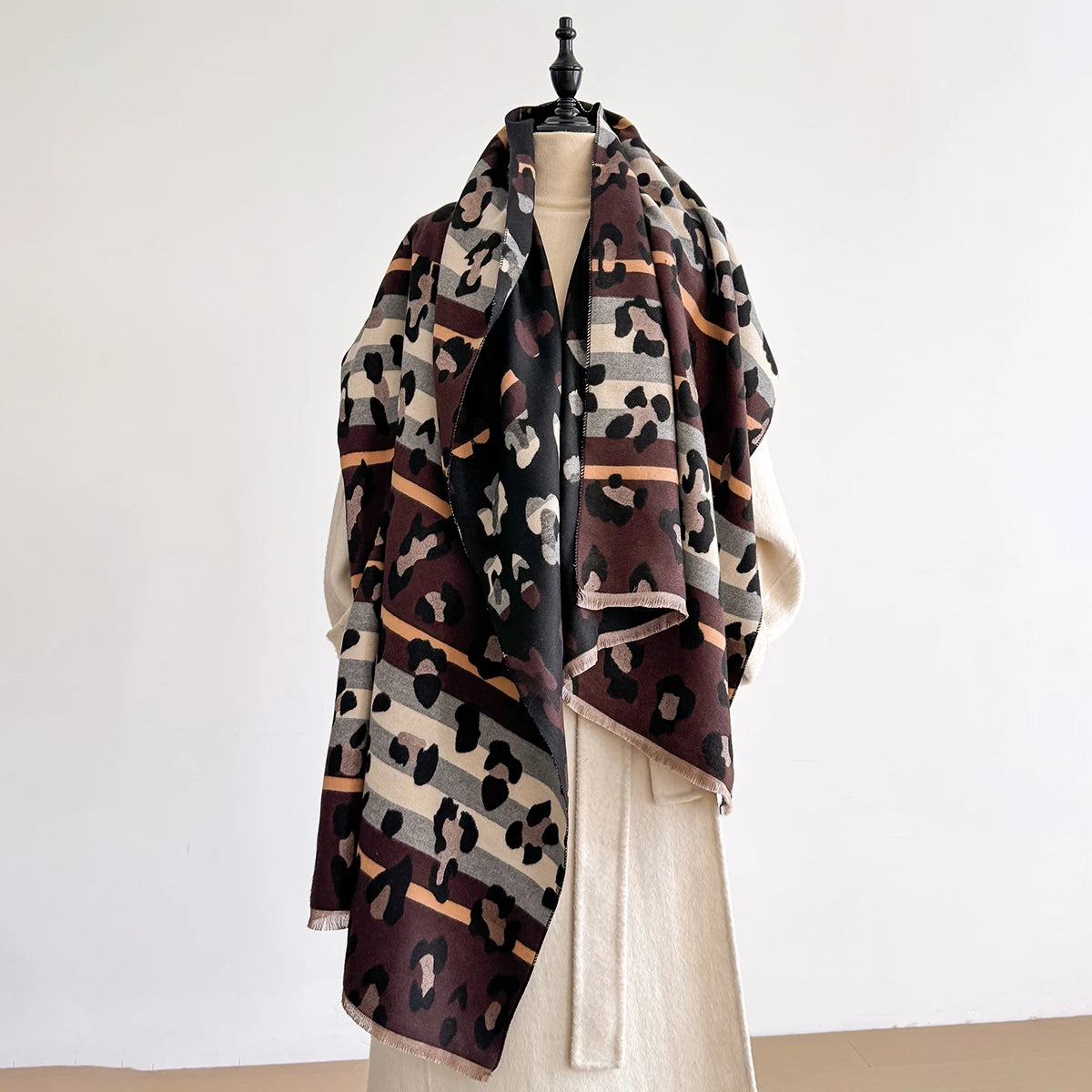 ✨ Points clés : Fausse laine épaissie • Finition satin luxueuse • Design mode tendance • Polyvalente • Imprimé léopard sophistiqué • Douce et chaude