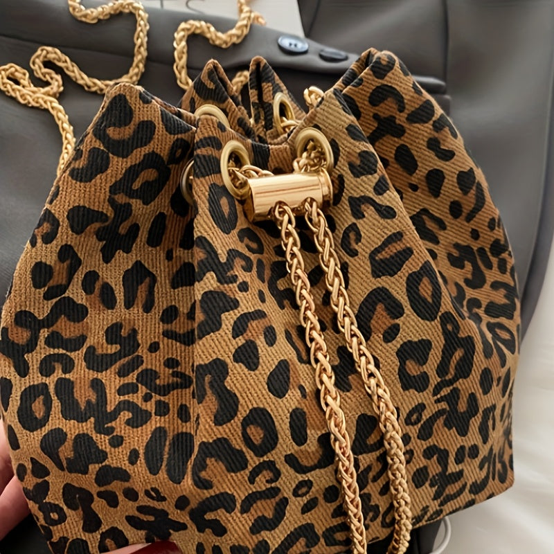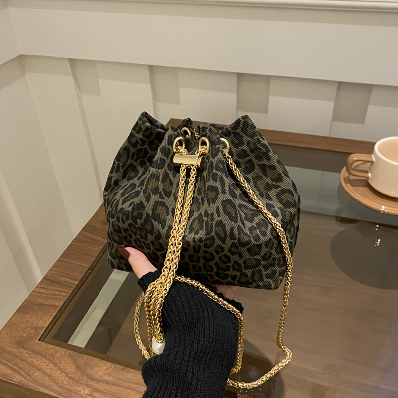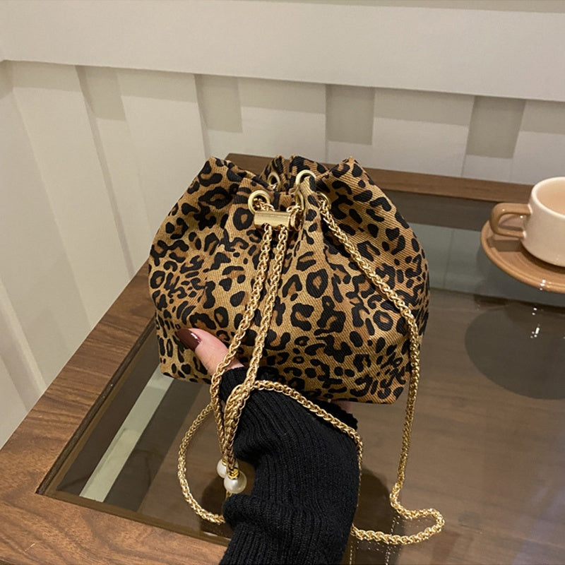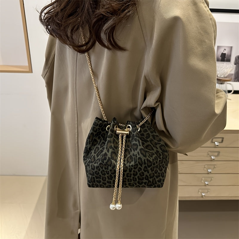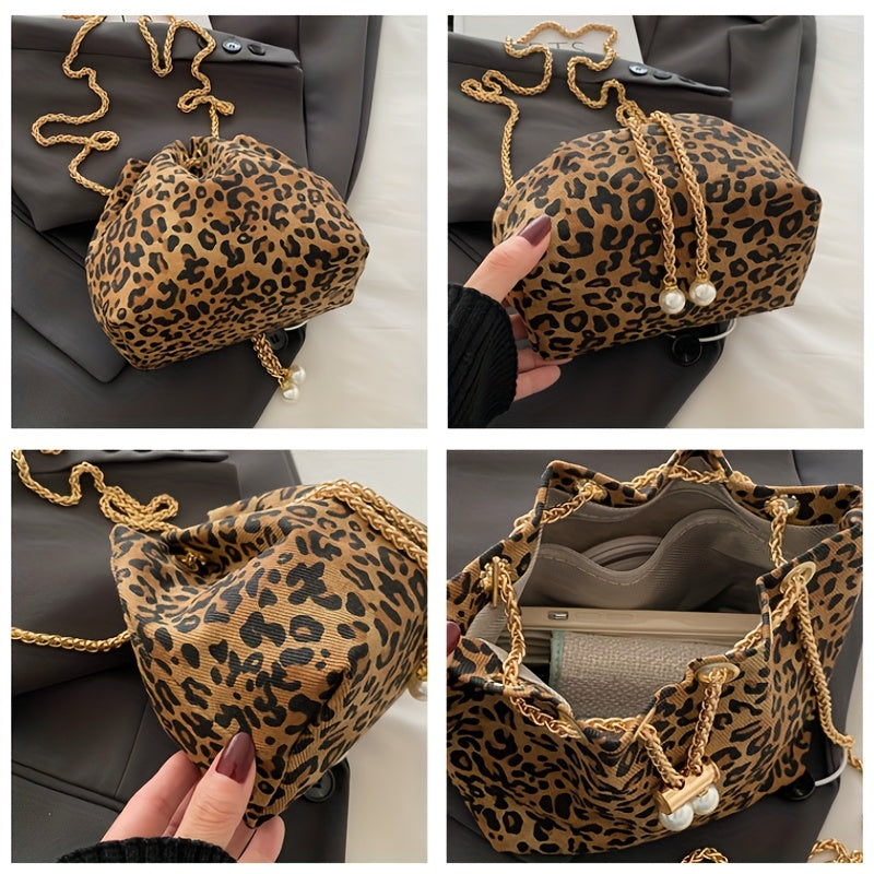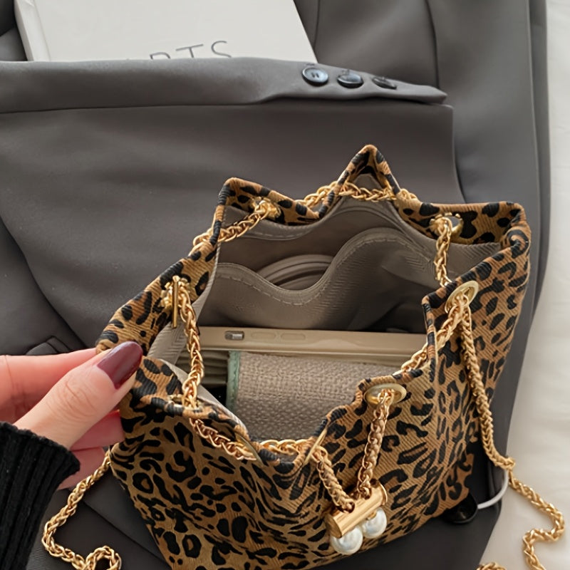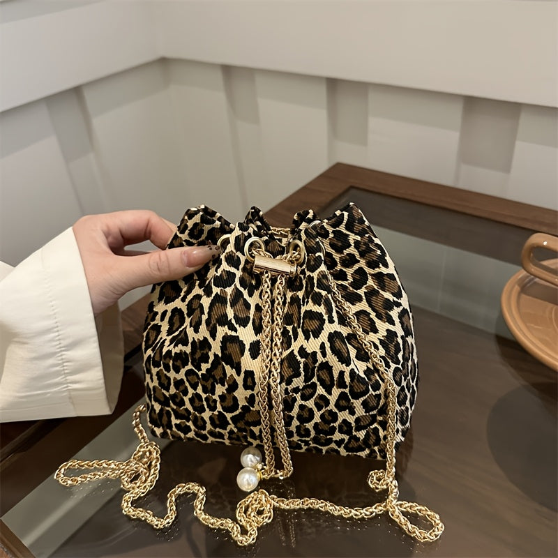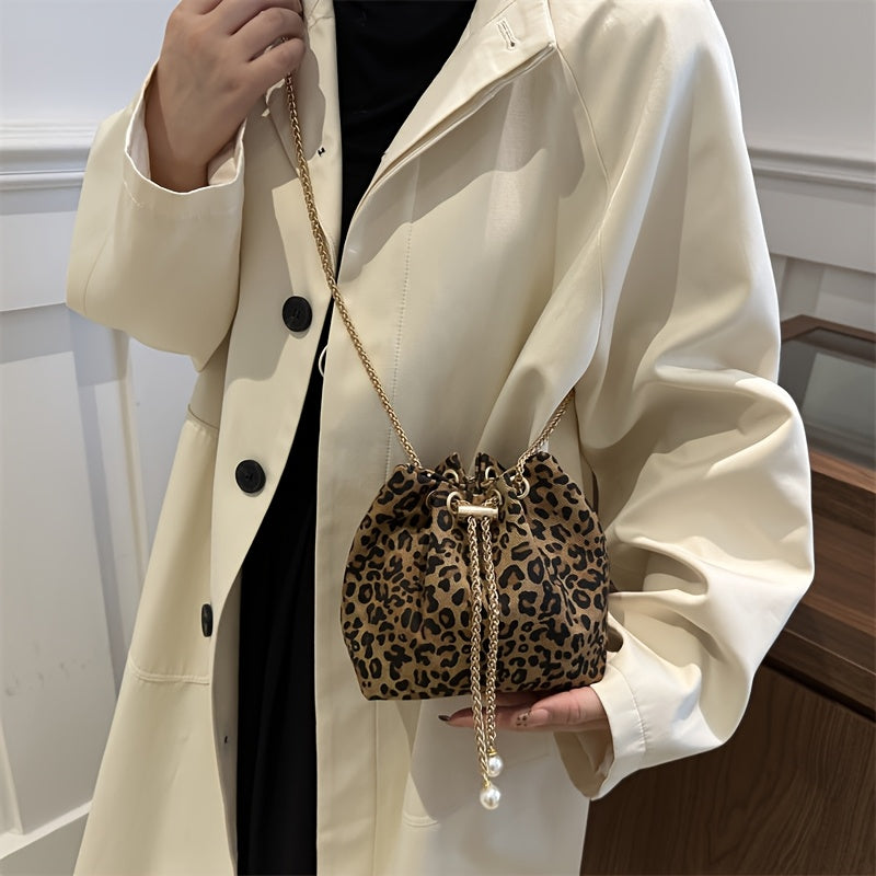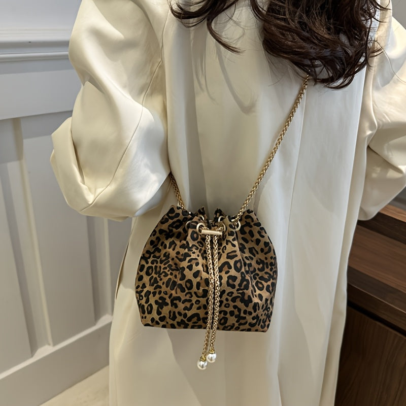 Le charme rétro avec accents perles. Ce sac seau à imprimé léopard avec embellissements perles allie style vintage et élégance pour vos occasions spéciales. Avec sa bandoulière détachable ajustable et sa fermeture à cordon, c'est l'accessoire glamour parfait.